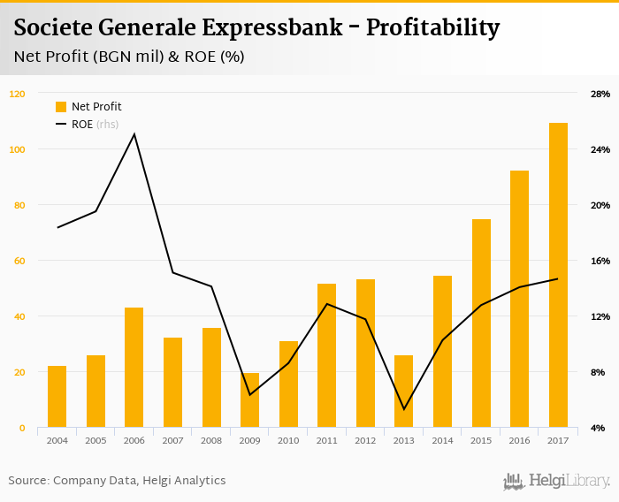 Societe Generale Expressbank made a net profit of BGN 109 mil in 2017, up 18.3% compared to the previous year. This implies a return on equity of 14.6%.