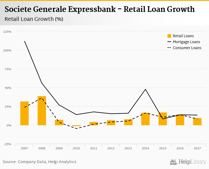 Societe Generale Expressbank's retail loans reached BGN 1,539 mil at the end of 2017, up 9.70% compared to the previous year. In the last decade, the average annual loan growth amounted to 11.7%.