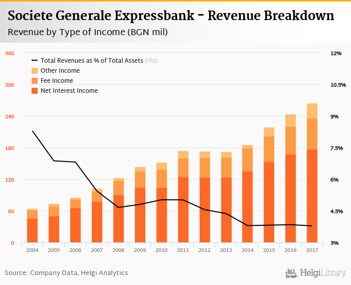 Comparing Societe Generale Expressbank with its closest peers, DSK Bank generated total revenues of 5.78% of assets in 2017, United Bulgarian Bank operated with 4.70% revenue margin and Raiffeisenbank Bulgaria produced total income worth 4.37% of assets.