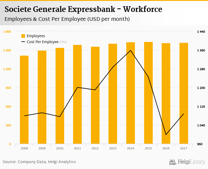 Societe Generale Expressbank employed 1,621 persons in 2017, up 0.558% when compared to the previous year. Historically, the bank's workforce hit an all time high of 1,631 persons in 2015 and an all time low of 1,412 in 2008.