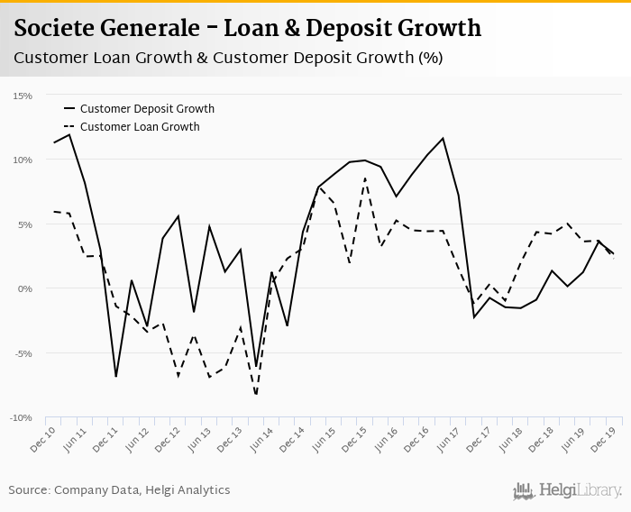 Societe Generale's customer loan growth reached 2.27% in 2019-12-31, down from 4.19% compared to the previous year. Historically, the bank’s loans growth reached an all time high of 8.51% in 2015-12-31 and an all time low of -8.49% in 2014-03-31. In the last decade, the average annual loan growth amounted to 0%.