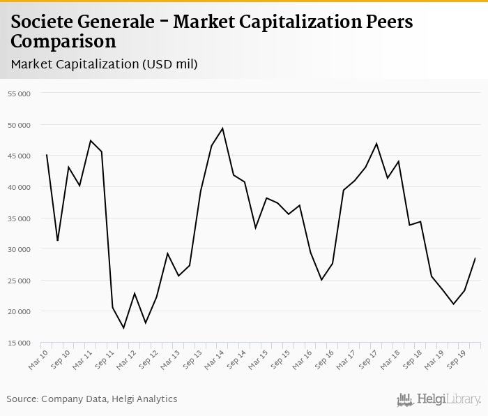 Societe Generale stock traded at 31.4 per share at the end of fourth quarter of 2019 implying a market capitalization of USD 28,541 mil.