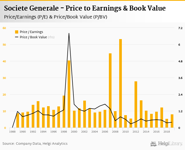 Societe Generale stock traded at EUR 31.4 per share at the end 2019 implying a market capitalization of USD 28,541 mil.