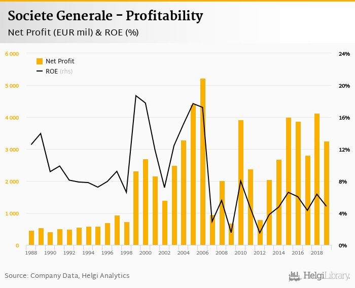 Societe Generale made a net profit of EUR 3,248 mil in 2019, down 21.2% compared to the previous year. This implies a return on equity of 4.83%.