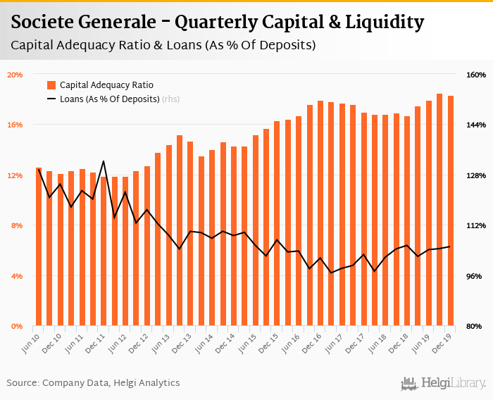 Societe Generale's capital adequacy ratio reached 18.3% at the end of fourth quarter of 2019, down from 18.5% when compared to the previous quarter. Historically, the bank’s capital ratio hit an all time high of 18.5% in 3Q2019 and an all time low of 11.9% in 4Q2011.