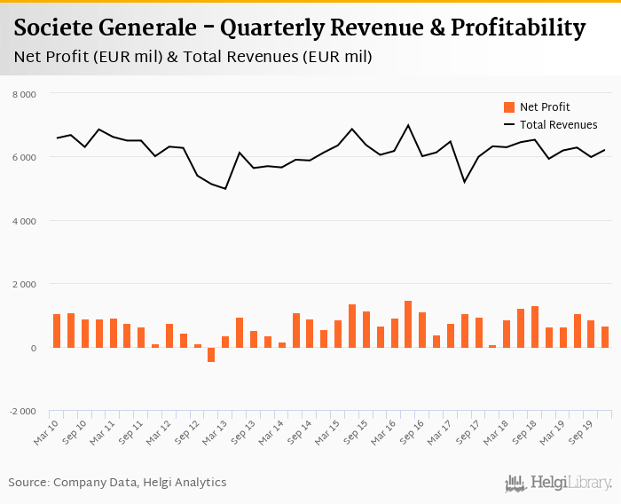 Societe Generale made a net profit of EUR 654 mil under revenues of EUR 6,213 mil in the fourth quarter of 2019, up 4.81% and 4.83% respectively when compared to the same period last year.