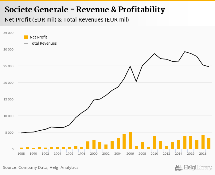 Societe Generale made a net profit of EUR 3,248 mil under revenues of EUR 24,671 mil in 2019, up -21.2% and -2.12% respectively compared to the previous year.