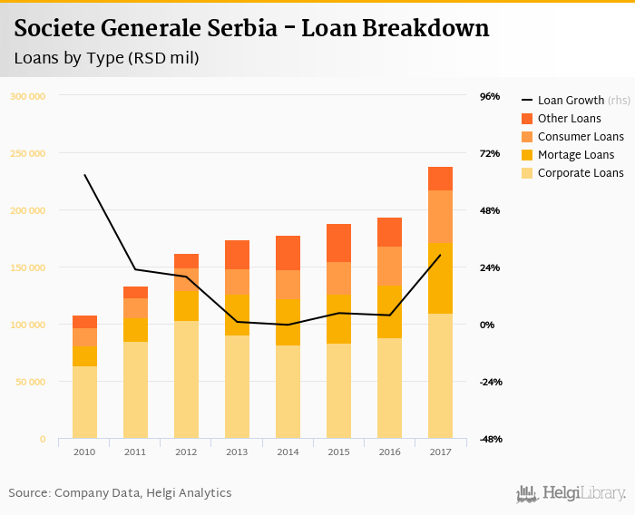 At the end of 2017, Societe Generale Serbia's loans accounted for 131% of total deposits and 73.7% of total assets.