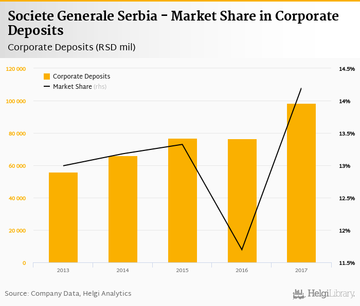Societe Generale Serbia's corporate deposits reached RSD 98,550 mil in 2017, up 29.0% compared to the previous year.