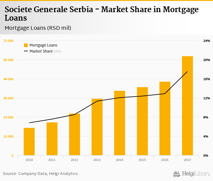 Societe Generale Serbia's mortgage loans reached RSD 62,305 mil in 2017, up 34.7% compared to the previous year.