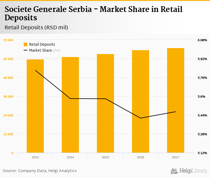 Societe Generale Serbia's retail deposits reached RSD 66,876 mil in 2017, up 2.12% compared to the previous year.