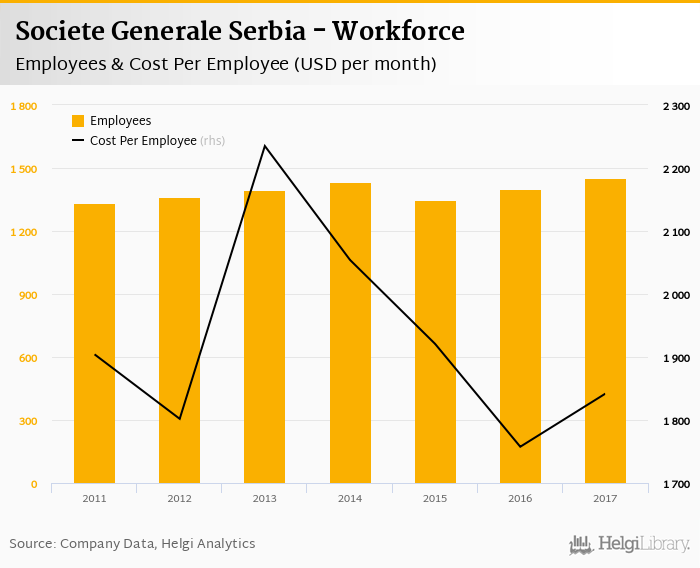 Societe Generale Serbia employed 1,451 persons in 2017, up 3.64% when compared to the previous year. Historically, the bank's workforce hit an all time high of 1,451 persons in 2017 and an all time low of 1,331 in 2011.