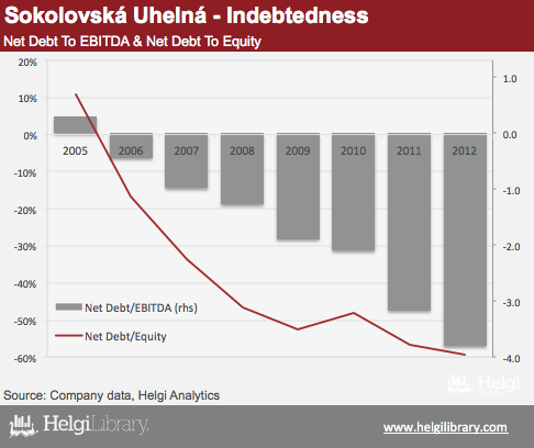 From its peak in 2007-2008 when the Company reached record sales of CZK 11.4 bil, the revenues have been falling to CZK 7.8 bil in 2012. The pressure on profitability is even bigger, though. Since 2008, Sokolovská's net profit dropped 60% to CZK 899 mil in 2012