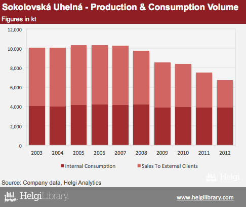 From its peak in 2007-2008 when the Company reached record sales of CZK 11.4 bil, the revenues have been falling to CZK 7.8 bil in 2012. The pressure on profitability is even bigger, though. Since 2008, Sokolovská's net profit dropped 60% to CZK 899 mil in 2012