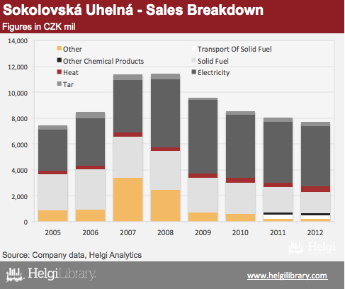 From its peak in 2007-2008 when the Company reached record sales of CZK 11.4 bil, the revenues have been falling to CZK 7.8 bil in 2012. The pressure on profitability is even bigger, though. Since 2008, Sokolovská's net profit dropped 60% to CZK 899 mil in 2012