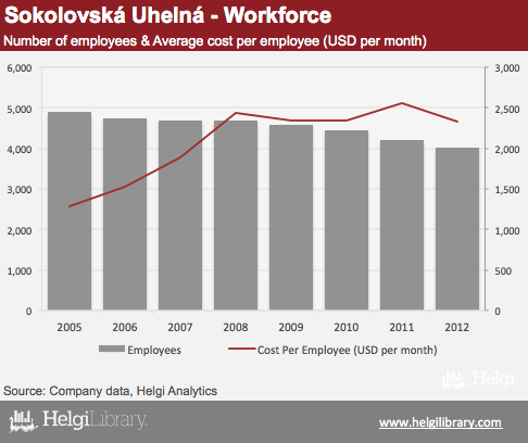 In 2012, the Company employed 4,007 persons in the Czech Republic. The average staff cost reached USD 2,335 per person and month