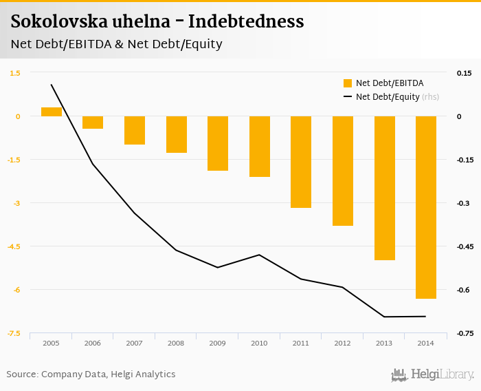Sokolovska uhelna's net debt stood at CZK -10,171 mil and accounted for -0.695 of equity at the end of 2014. The ratio is up 0.001 pp compared to the previous year.