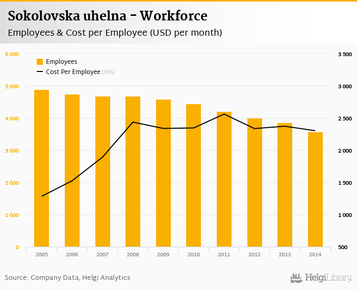 Sokolovska uhelna employed 3,570 employees in 2014, down 7.42% compared to the previous year. Historically, between 2003 and 2014, the firm's workforce hit a high of 5,373 employees in 2003 and a low of 3,570 employees in 2014.