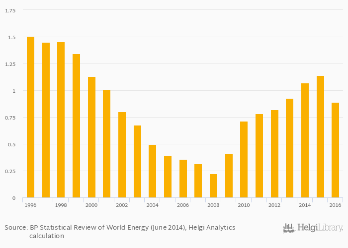 Solar capacity as a share of worldwide installed photovoltaic power fell 21.9% to 0.888% in Canada in 2016, according to World Bank / EIA.