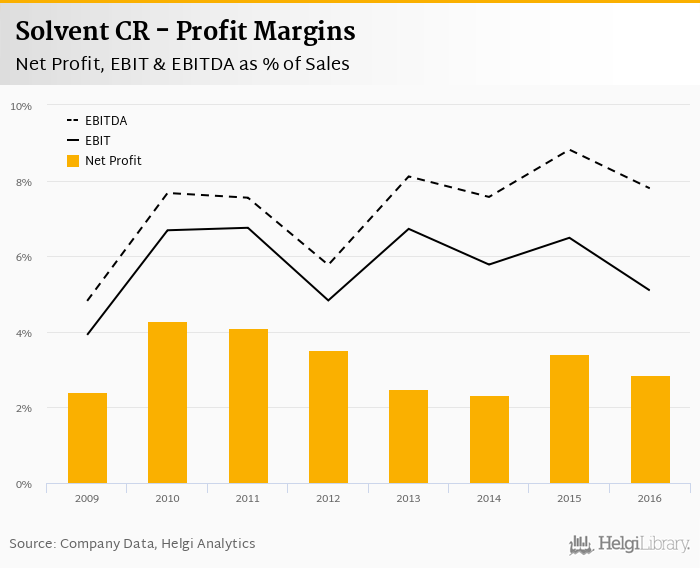 Solvent CR made a net profit of CZK 249 mil with revenues of CZK 8,707 mil in 2016, down by 5.07% and up by 13.1%, respectively, compared to the previous year.