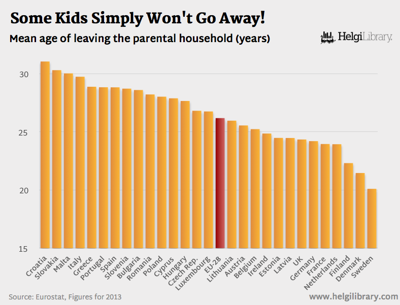 According to the Eurostat, young people were not inclined to leave the parental home until the age of 27 for men and 25 for women in the EU28. In Croatia, Slovakia, Malta and Italy, the mean age of leaving the parental home was 30 or above in 2013. By contrast, young people in Sweden, Denmark and Finland left the parental home, on average, before the age of 23.