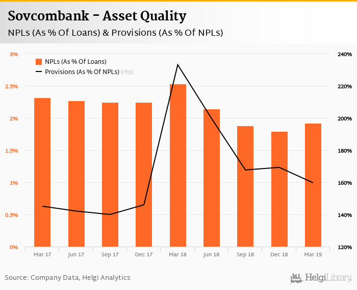 Sovcombank's non-performing loans reached 1.92% of total loans at the end of 2019-03-31, down from 2.53% compared to the previous year. Historically, the NPL ratio hit an all time high of 2.53% in 2018-03-31 and an all time low of 1.79% in 2018-12-31.