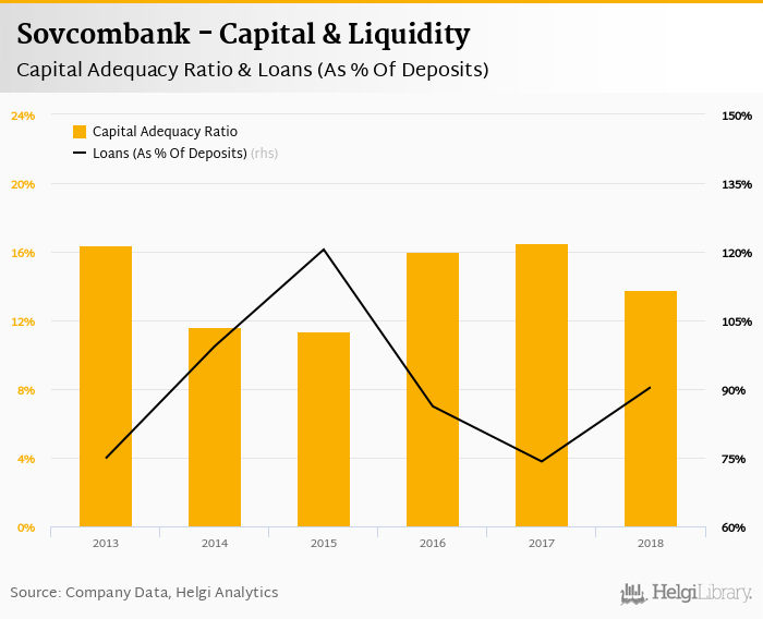 Sovcombank's capital adequacy ratio reached 13.8% at the end of 2018, down from 16.5% compared to the previous year. Historically, the bank’s capital ratio hit an all time high of 16.5% in 2017 and an all time low of 11.4% in 2015.