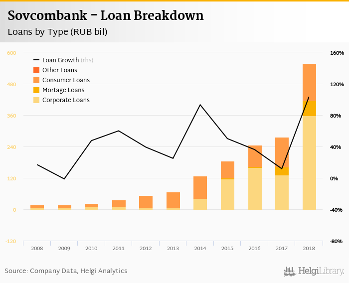 At the end of 2018, Sovcombank's loans accounted for 90.4% of total deposits and 56.0% of total assets.