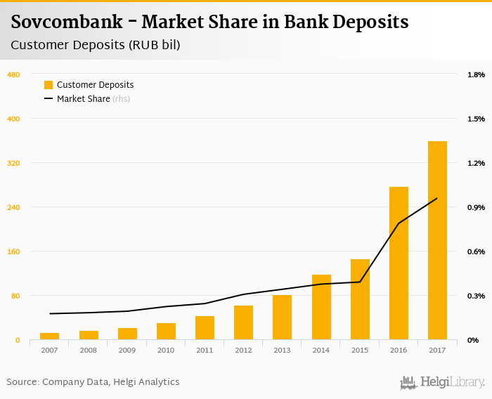 Sovcombank accounted for 0.958% of all customer deposits taken by banks in Russia at the end of 2017. Historically, the bank’s market share in customer deposits reached an all time high of 0.958% in 2017 and an all time low of 0.174% in 2007.