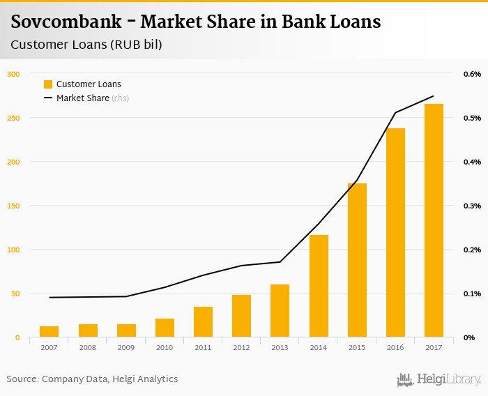 Sovcombank accounted for 0.548% of all customer loans issued in Russia at the end of 2017. Historically, the bank’s market share in customer loans reached an all time high of 0.548% in 2017 and an all time low of 0.089% in 2007.