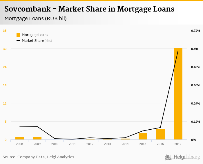 Sovcombank accounted for 0.583% of all mortgage loans issued in Russia at the end of 2017. Historically, the bank’s market share in mortgage loans reached an all time high of 0.583% in 2017 and an all time low of 0.002% in 2011.