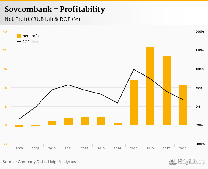 Sovcombank made a net profit of RUB 17.4 bil in 2018, down 41.0% compared to the previous year. This implies a return on equity of 17.5%.