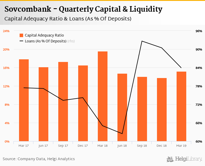 Sovcombank's capital adequacy ratio reached 15.2% at the end of first quarter of 2019, up from 13.8% when compared to the previous quarter. Historically, the bank’s capital ratio hit an all time high of 19.5% in 1Q2018 and an all time low of 13.8% in 4Q2018.