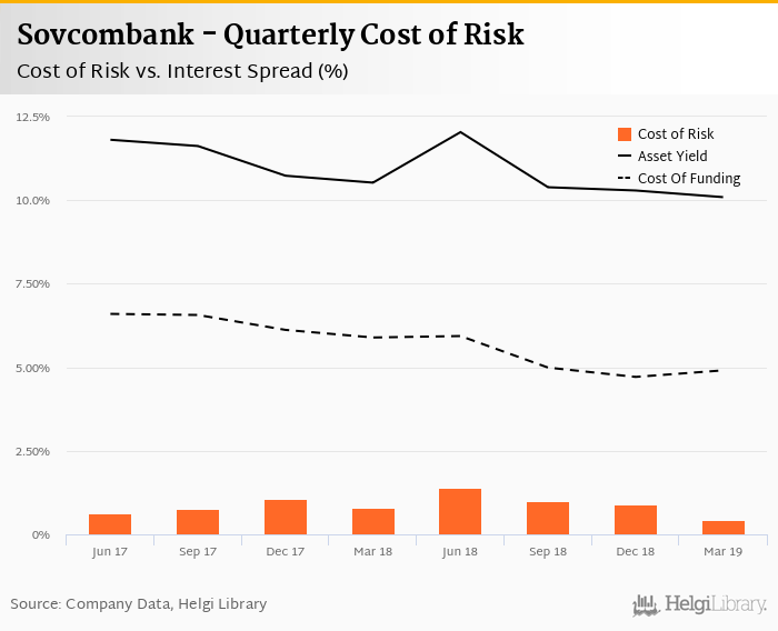 Sovcombank's Cost of Risk (loan loss provisions as % of total assets) amounted to 0.436% in the first quarter of 2019, down from 0.913% when compared to the previous quarter.