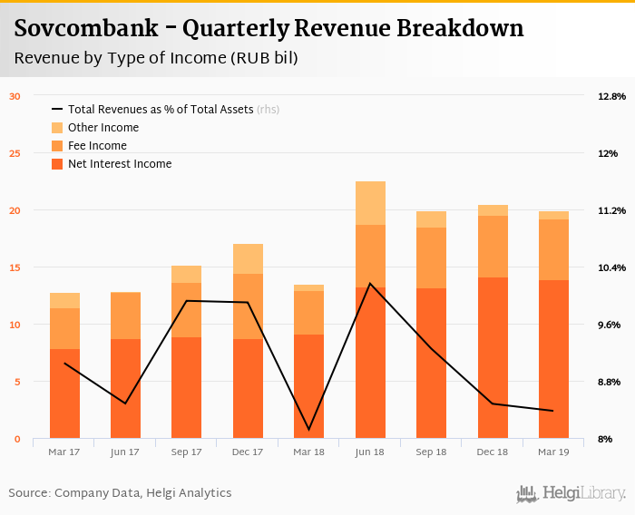 Sovcombank generated total banking revenues of RUB 20.0 bil in the first quarter of 2019, up 48.3% when compared to the same period of last year and down 2.7% when compared to the previous quarter.