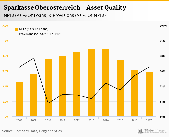 Sparkasse Oberosterreich's non-performing loans reached 3.54% of total loans at the end of 2017, down from 3.72% compared to the previous year. Historically, the NPL ratio hit an all time high of 5.35% in 2013 and an all time low of 2.74% in 2008.