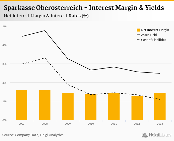 Sparkasse Oberosterreich's net interest margin amounted to 1.45% in 2013, up from 1.30% compared to the previous year.