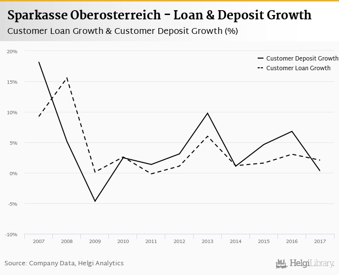 Sparkasse Oberosterreich's customer loan growth reached 2.08% in 2017, down from 3.05% compared to the previous year. Historically, the bank’s loans growth reached an all time high of 15.5% in 2008 and an all time low of -0.163% in 2011. In the last decade, the average annual loan growth amounted to 3.22%.