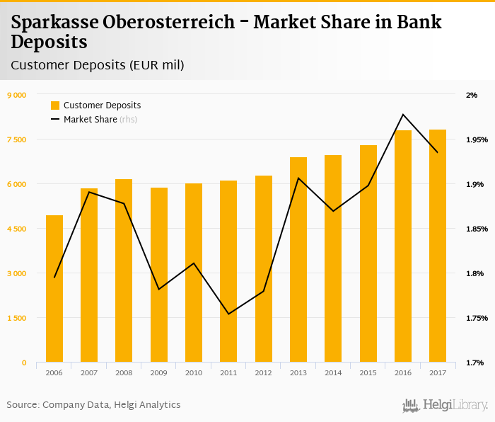 Sparkasse Oberosterreich accounted for 1.93% of all customer deposits taken by banks in Austria at the end of 2017. Historically, the bank’s market share in customer deposits reached an all time high of 1.98% in 2016 and an all time low of 1.75% in 2011.