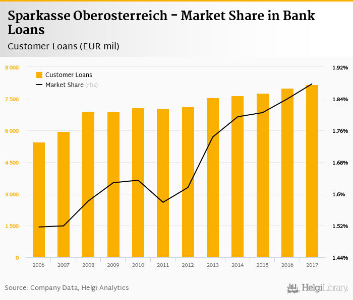 Sparkasse Oberosterreich accounted for 1.88% of all customer loans issued in Austria at the end of 2017. Historically, the bank’s market share in customer loans reached an all time high of 1.88% in 2017 and an all time low of 1.52% in 2006.
