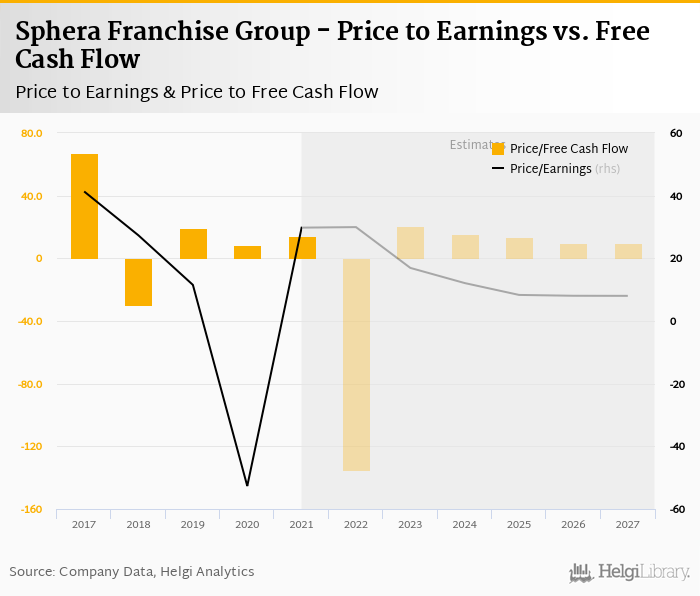 Regarding cash generated defined by the sum of net profit and depreciation, the stock traded at 5.66x at the end of 2021. When investments are excluded to get free cash flow, Sphera Franchise Group traded at 14.0x.