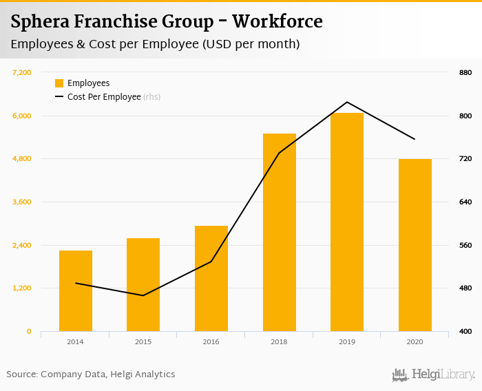 Sphera Franchise Group employed 4,802 employees in 2020, down 21.1% compared to the previous year. Historically, between 2014 and 2020, the firm's workforce hit a high of 6,084 employees in 2019 and a low of 2,268 employees in 2014.