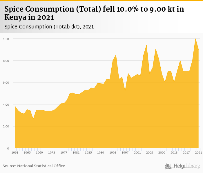 Total spice consumption fell 10.0% to 9.00 kt in Kenya in 2021, according to Faostat.