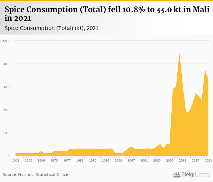 Total spice consumption fell 10.8% to 33.0 kt in Mali in 2021, according to Faostat.