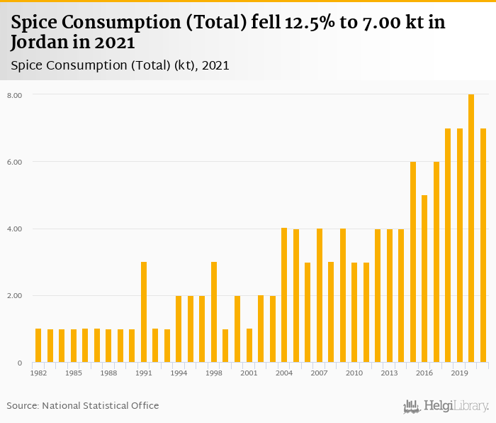 Total spice consumption fell 12.5% to 7.00 kt in Jordan in 2021, according to Faostat.