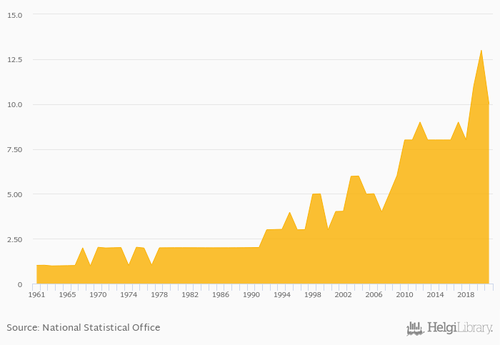 Historically, total spice consumption in Denmark reached an all time high of 13.0 kt in 2020 and an all time low of 0.980 kt in 1969. When compared to Denmark's main peers, total spice consumption in Germany amounted to 82.0 kt, 38.0 kt in Netherlands, 3.00 kt in Norway and 12.0 kt in Sweden in 2021.