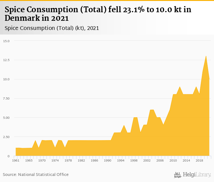 Total spice consumption fell 23.1% to 10.0 kt in Denmark in 2021, according to Faostat.