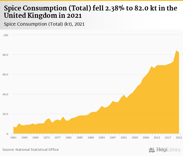 Total spice consumption fell 2.38% to 82.0 kt in the United Kingdom in 2021, according to Faostat.