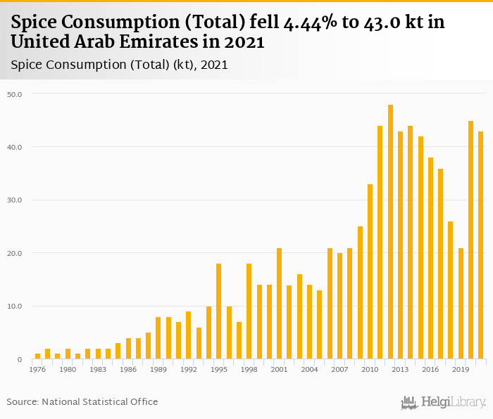 Total spice consumption fell 4.44% to 43.0 kt in United Arab Emirates in 2021, according to Faostat.