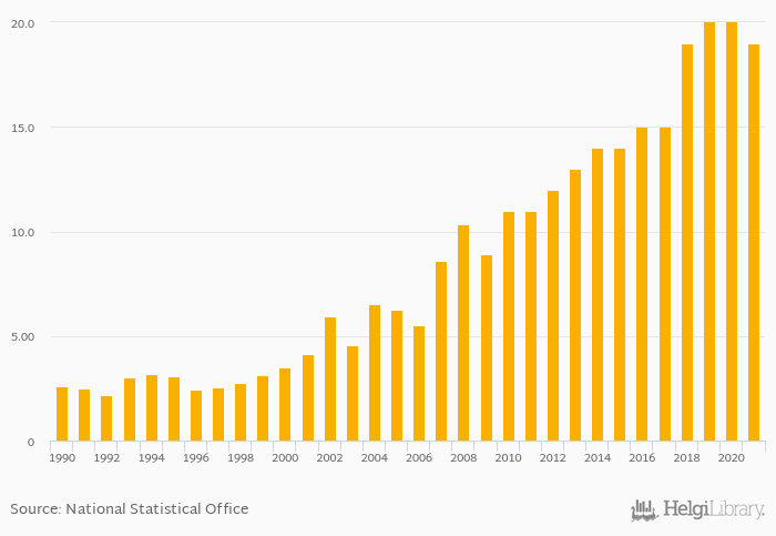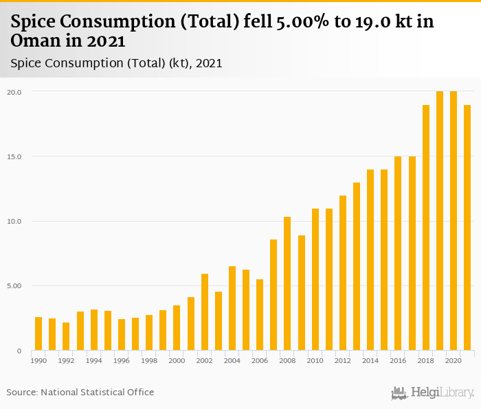 Total spice consumption fell 5.00% to 19.0 kt in Oman in 2021, according to Faostat.